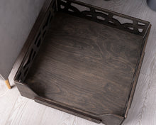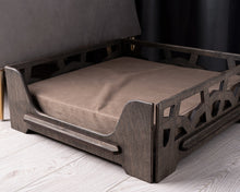 - This elevated dog bed features a square mattress and a decorative wooded frame.